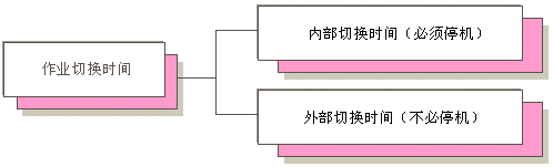 如圖所示,品種(作業(yè))切換時(shí)間主要可以劃分為內(nèi)部切換時(shí)間和外部切換時(shí)間。在JIT方式下,流水線(xiàn)的換線(xiàn)只需要將新的產(chǎn)品送到第一個(gè)工序,后面跟著生產(chǎn)線(xiàn)流動(dòng),這樣就能順利地完成換線(xiàn)。因此,流水線(xiàn)的換線(xiàn)屬于外部切換,不需要停機(jī),切換時(shí)間較短。但是,模具、刀具和工裝夾具等的切換必須停機(jī),流水線(xiàn)將會(huì)中斷。