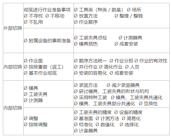 “一個(gè)流”生產(chǎn)的關(guān)鍵是如何縮短品種切換的時(shí)間。如表所示,為了縮短品種切換時(shí)間,就需要注意一系列的要點(diǎn)。對(duì)于外部切換,主要是要徹底進(jìn)行作業(yè)準(zhǔn)備和附屬設(shè)備的事前準(zhǔn)備;對(duì)于內(nèi)部切換,則可以通過(guò)規(guī)范和簡(jiǎn)化基本作業(yè)、標(biāo)準(zhǔn)化模具以及相應(yīng)的調(diào)整來(lái)縮短切換時(shí)間。