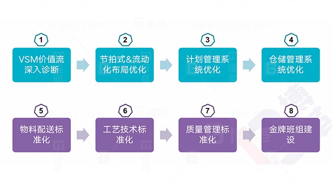 經(jīng)過20多年的沉淀和實踐,上海博革咨詢總結出適合國內(nèi)制造型企業(yè)精益管理變革的模型BPS。下面的“精益生產(chǎn)推進8大步驟”是從BPS模型中導出的,適合國內(nèi)絕大部分機械行業(yè)的精益生產(chǎn)推進方法。