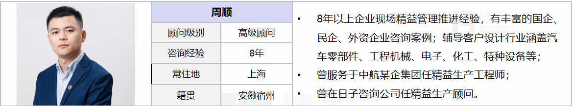擅長業(yè)務(wù):工廠前期調(diào)研診斷、大項目管理、現(xiàn)場基礎(chǔ)管理提升、精益布局規(guī)劃、大型倉儲規(guī)劃、QCD改善項目落地、IE改善手法、PMC管理、質(zhì)量管理、精益生產(chǎn)成本降低、精益生產(chǎn)配送管理、精益物流-成套供應(yīng)物料模式、標準工時開發(fā)、SMED快速換模換線、ERP/MES管理軟件導(dǎo)入、現(xiàn)場6S改善、目視化提升、基層培養(yǎng)-打造班組管理、KAIZEN持續(xù)改善、企業(yè)文化推行和落地系統(tǒng)的研究;