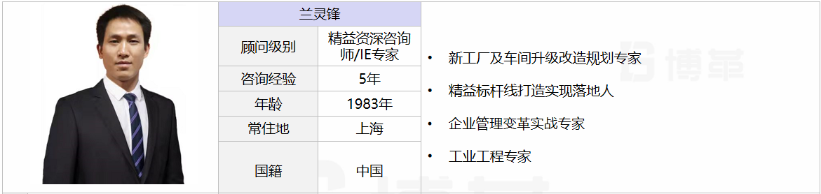擅長領(lǐng)域:制造管理(精益生產(chǎn)、品質(zhì)管理、 5S管理、 班組管理、TPM管理等IE改善(新工廠規(guī)劃、老工廠車間升級(jí)改造/搬遷、物流規(guī)劃、七大手法、動(dòng)作研究、時(shí)間研究、LAYOUT設(shè)計(jì)、線平衡等)
