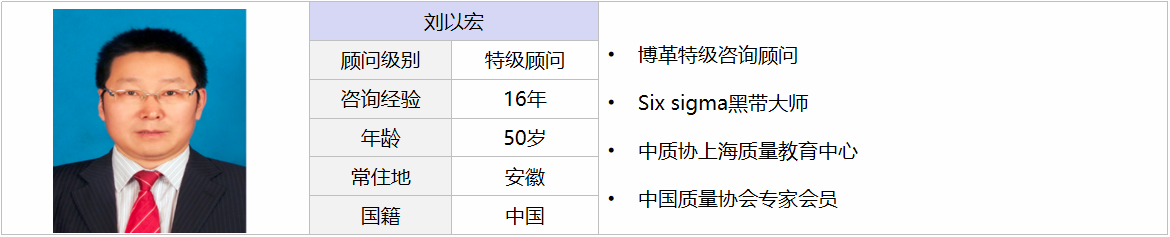 熟悉行業(yè):電子、半導(dǎo)體、制藥、鋼鐵、汽車制造、機(jī)械加工等。 擅長業(yè)務(wù):將精益Six sigma方法論與公司戰(zhàn)略流程梳理、質(zhì)量管理體系、質(zhì)量信息化應(yīng)用等相結(jié)合。自主編寫了新老QC七大工具、SPC教材、、PPAP、MSA、FMEA、Six sigma綠帶、質(zhì)量工具箱技術(shù)結(jié)合Minitab軟件、ISO9000及TS16949內(nèi)審員等的各類培訓(xùn)教材。