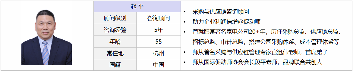 擅長業(yè)務(wù):采購體系、供應(yīng)商開發(fā)、供應(yīng)商幫扶、標(biāo)準(zhǔn)成本、采購風(fēng)險(xiǎn)、供應(yīng)鏈審計(jì)、數(shù)字化系統(tǒng)導(dǎo)入。