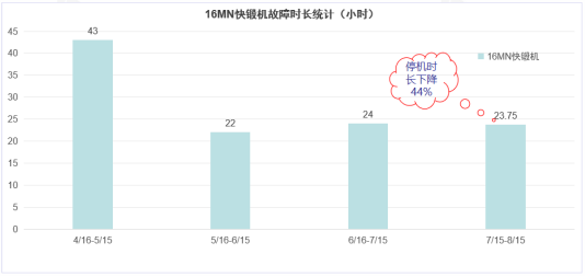 金航鈦業(yè)2023年關(guān)鍵設(shè)備快鍛機因設(shè)備故障停機4個月,2024年導(dǎo)入TPM活動之后,每月的停機時長逐步縮減。
