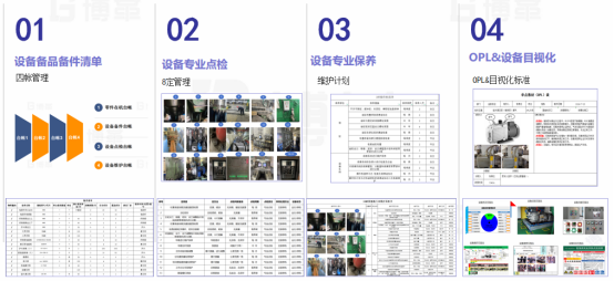第三步建立健全設(shè)備專業(yè)維護(hù)標(biāo)準(zhǔn),將設(shè)備專業(yè)維護(hù)分為專業(yè)點檢、專業(yè)保養(yǎng)、備品備件管理、設(shè)備目視化與知識教導(dǎo)OPL。通過設(shè)備專業(yè)維護(hù)導(dǎo)入,對于之前模糊的遺漏的維護(hù)點位有了清晰的認(rèn)識,讓專業(yè)維護(hù)人員對什么時候要做什么有了充分的了解和準(zhǔn)備。推動設(shè)備定期專業(yè)維護(hù),形成每周進(jìn)行一次專業(yè)維護(hù),并逐步優(yōu)化每周專業(yè)維護(hù)的內(nèi)容。