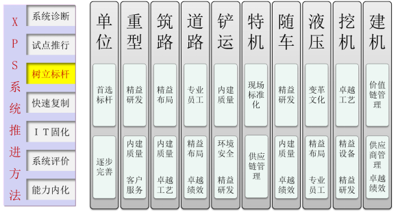 XPS根據(jù)A集團(tuán)及所處行業(yè)的特點(diǎn),在A集團(tuán)的十二五戰(zhàn)略目標(biāo)為愿景,制定了世界級企業(yè)關(guān)注的5大目標(biāo),工程機(jī)械行業(yè)運(yùn)營中最重要的12大模塊,提煉出58項(xiàng)要素和235項(xiàng)要求。
