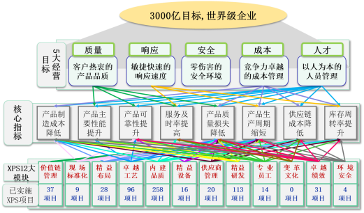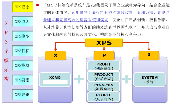 “XPS持續(xù)變革系統(tǒng)”是以集團(tuán)及下屬企業(yè)戰(zhàn)略為導(dǎo)向,結(jié)合企業(yè)運(yùn)營的具體情況,運(yùn)用世界上最行之有效的績效改善工具和方法,幫助企業(yè)建立和完善高效的運(yùn)營系統(tǒng)和模式,使企業(yè)在產(chǎn)品創(chuàng)新、流程創(chuàng)新、人才培養(yǎng)、利潤創(chuàng)新等方面的績效達(dá)到世界領(lǐng)先水平,并形成與企業(yè)自身文化相融合的持續(xù)改善文化,構(gòu)筑企業(yè)的核心競爭力。