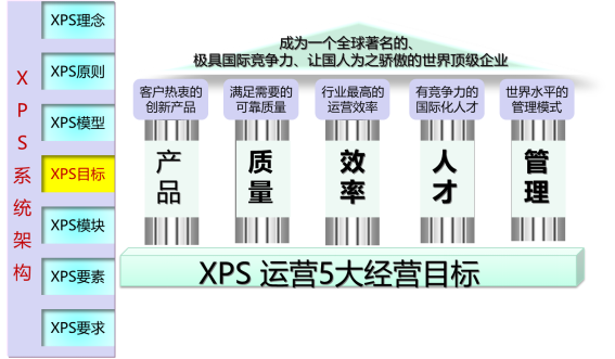 XPS的目標(biāo)是幫助A成為世界頂級的企業(yè),世界頂級的企業(yè)必須能夠提供客戶認(rèn)可的世界頂級的產(chǎn)品,滿足各種需要的世界頂級的質(zhì)量,行業(yè)最高的運(yùn)營效率,具有競爭力的國際化人才,以及世界水平的管理運(yùn)營模式