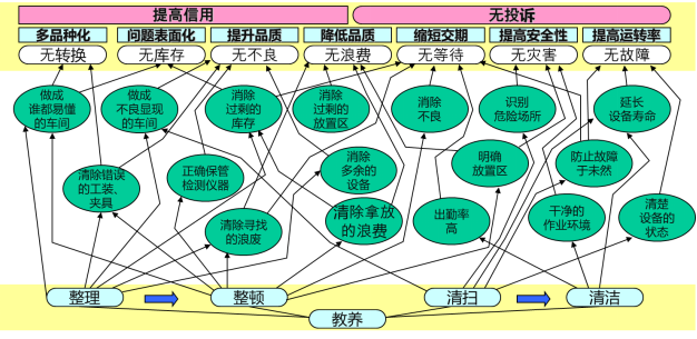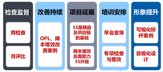 改善持續(xù)性的保證、領導表率、逐漸有序培訓、全員參與、自動自發(fā)、讓5S變成企業(yè)的一種基本素質、基本工具、精益管理的基本功.