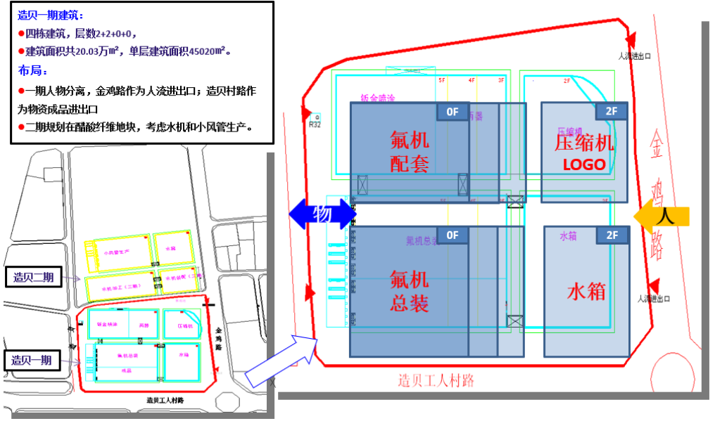 - 一期人物分離,金雞路作為人流進(jìn)出口;造貝村路作為物資成品進(jìn)出口