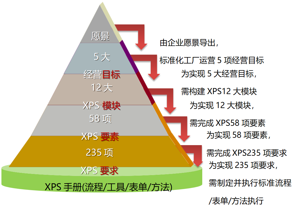 XPS系統(tǒng)架構(gòu)分由理念、原則、模型、目標(biāo)、要素、要求部分構(gòu)成,其理念為:“XPS-A持續(xù)變革系統(tǒng)”是以A集團(tuán)及下屬企業(yè)戰(zhàn)略為導(dǎo)向,結(jié)合企業(yè)運(yùn)營(yíng)的具體情況,運(yùn)用世界上最行之有效的績(jī)效改善工具和方法,幫助企業(yè)建立和完善高效的運(yùn)營(yíng)系統(tǒng)和模式-XPS持續(xù)變革系統(tǒng),使企業(yè)在產(chǎn)品創(chuàng)新、流程創(chuàng)新、人才培養(yǎng)、利潤(rùn)創(chuàng)新等方面的績(jī)效達(dá)到世界領(lǐng)先水平,并形成與企業(yè)自身文化相融合的持續(xù)改善文化,構(gòu)筑企業(yè)的核心競(jìng)爭(zhēng)力。“