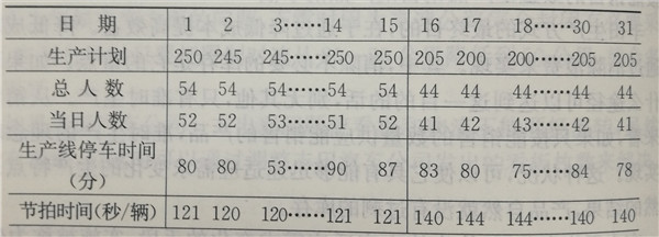 因為汽車的需求季節(jié)性變化大,所以月與月之間生產(chǎn)量的波動是不可避免的。但是,在一個月當中,能夠消除天與天之間生產(chǎn)量的波動。例如,批量生產(chǎn)的車種花冠的整體生產(chǎn)計劃,首先要按照那個月的預測需求量制定以月為單位的生產(chǎn)數(shù)量計劃。通過簡單地用這個月的勞動天數(shù)去除月生產(chǎn)數(shù)量,求出每天的生產(chǎn)輛數(shù),就可以計劃出每天定量生產(chǎn)的平均輛數(shù),這就是總量均衡在這個總量均衡的概念中,不考慮花冠有多樣的規(guī)格種類,只考慮從整體上看花冠這一大宗車種每天保持的平均生產(chǎn)量。