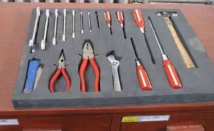 方法2:采用嵌入凹模的方法,使工具、零部件等物品易于取用和歸位。如沒有可用的現(xiàn)成凹模,可以自己動手,利用海棉、泡沫或厚質的臺墊,刻劃出物品形狀后,鏤空處理即可。